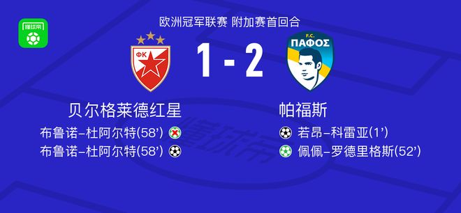 8月20日,北京的时间开始了欧洲冠军联赛季后赛的第一回合,贝尔格莱德的红星对阵帕福斯。在比赛开始时,Paphos Tankovic球员向Joao Correa提供了帮助,以帮助他得分。 Paphos球员Pepero Driguez通过处罚扩大了自己的分数。贝尔格莱德红星布鲁诺·杜阿尔特(Bruno Duarte)迅速调整并打进了进球,以进球。最终,比赛结束了,红星贝尔格莱德输给了帕福斯1-2。在伟大的时刻的第一分钟里,佩尔福斯坦克维奇(Perphos Tankovic)球员为支持乔阿·科雷亚(Joao Correa)的球门打进了进球。在第52分钟,Paphos Paphos Pepero Driguez获得了点球。在第58分钟,明星球员贝尔格莱德·雷德·杜阿尔特(Belgrade Red Bruno Duarte)失去了点球。在第58分钟,贝尔格莱德的红星布鲁诺·杜阿尔特(Bruno Duarte)打进了进球。设备对齐的技术统计数据