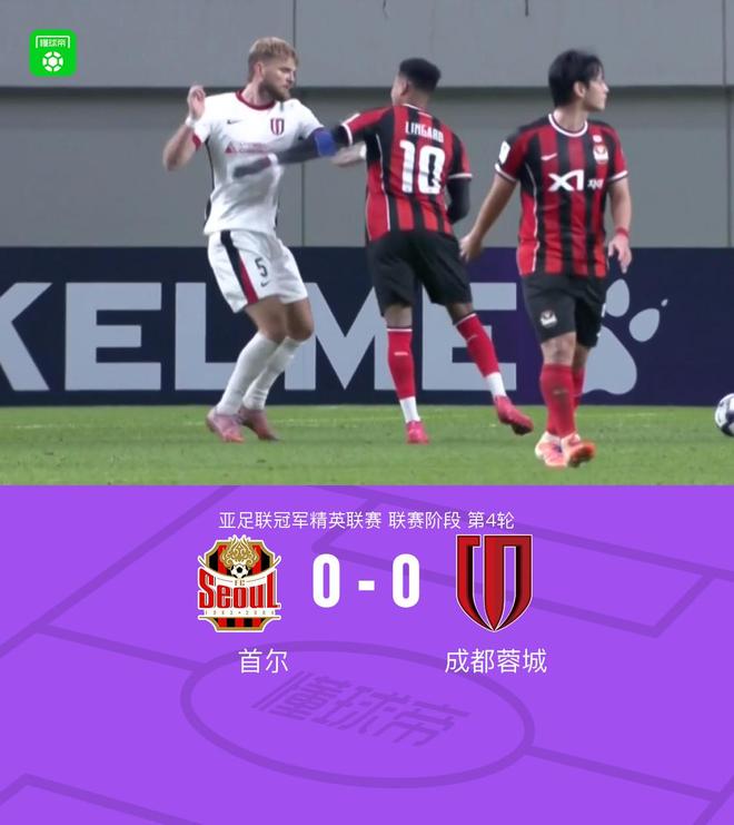 北京时间11月4日,亚冠联赛精英联赛第四轮,首尔队对阵成都队。比赛中,罗慕洛受伤离场,费利佩的进球因犯规被判无效。最终结果是首尔0-0成都。精彩时刻:两队球员上场。比赛进行到第9分钟,成都队发起反击。林煌没收了胡河涛的通行证。镜头里出现的是首尔队队长林加德。第25分钟,罗慕洛因伤被替换下场。第26分钟,德尔加多替补登场。罗慕洛泪流满面。第37分钟,林加德尝试射门远角,但皮球偏出。第42分钟,林加德与莱切特发生摩擦,两人互相推搡。雷希特在第45分钟和第1分钟的射门偏出,而费利佩在第51分钟的射门被挡出。第60分钟,李胜模尝试射门,皮球飞高。第60分钟,费利佩头球破门我领先了,但球偏出了球门。第63分钟,奥利维拉近角射门,但皮球被姜涛扑出。第73分钟,普林犯规,费利佩的进球被抵消,比分反超。第83分钟,首尔后卫崔俊受伤倒地,但比赛继续进行。第85分钟,德尔加多放倒金珍洙吃到黄牌。他在第89分钟伤愈复出。韦世豪替换廖荣翔出场。第90、2分钟,韦世豪尝试射门,但皮球偏出。球队阵容技术统计